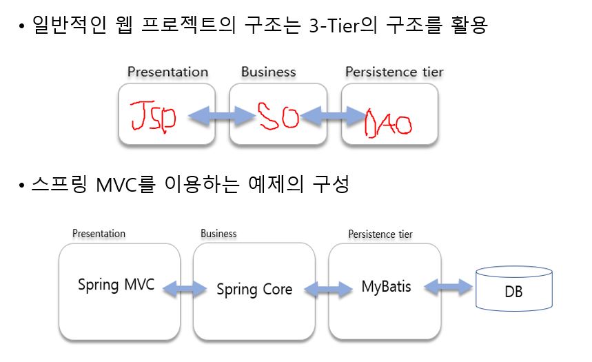 DAO(Data-Access-Object)나 Repository(저장소)라는 이름으로 영역을 따로 구성하는 것이 보편적. 예제에서는 별도의 DAO를 구성하는 대신에 MyBatis의 Mapper 인터페이스를 활용.