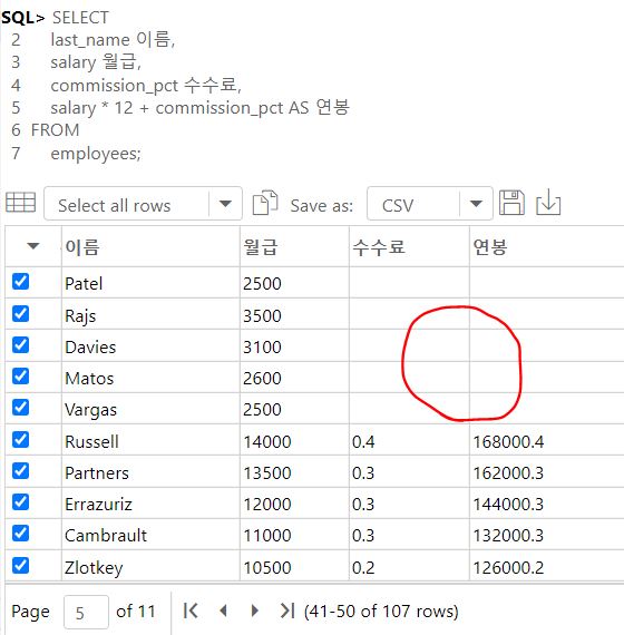 salary * 12 + commission_pct AS 연봉 -> 이 경우 수수료 없는 직원들은 연봉이 NULL임