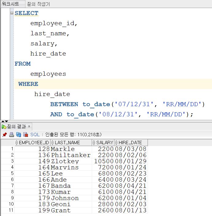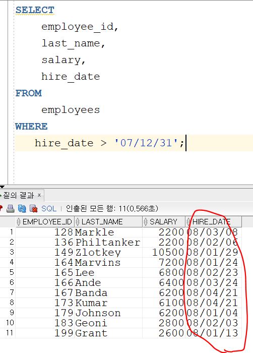 hire_date > to_date('07/12/31', 'RR/MM/DD'); -- 이렇게 쓰자 (이러면 VS에서도 가능)