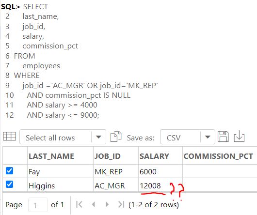 -- 1. AND 연산자가 우선실행 : 예상치 못한 결과