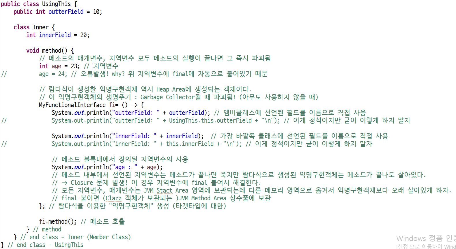 람다식 실행 블록에는 클래스의 멤버인 필드와 메소드 제약 없이 사용