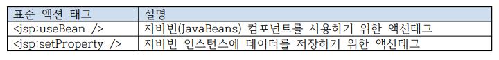 자바빈(JavaBeans)을 JSP에서 사용하기 위한 액션 태그이다. 기본적인 문법은 다음과 같다.