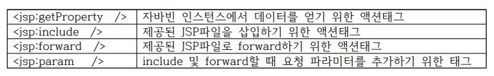 본적인 스크립팅 요소이외에 JSP 스펙(Specification)에서는 표준 액션 태그를 제공한다. 대표적인 스크립팅 요소인 Scriptlet tag안에는 많은 자바코드가 삽입되어 실행된다. JSP를 사용하는 목적이 Presentation Logic을 구현할 목적이기 때문에 많은 자바코드를 포함하고 있는 Scriptlet tag을 제거 및 감소할 목적으로 액션 태그가 제공되는 것이다. 즉 자바코드 대신에 액션 태그만을 가지고 동일한 결과를 얻을 수 있는 것이다. 추가로 액션 태그만을 가지고는 100% 자바코드를 제거할 수는 없으며 나중에 배울 JSTL 또는 EL 기능을 같이 추가하여 사용된다. 다음은 대표적인 표준 액션 태그 목록이다.