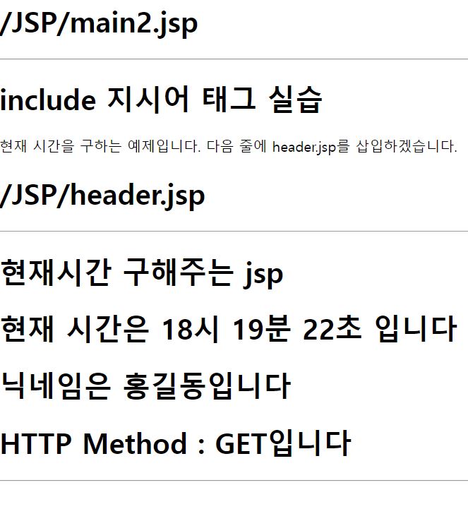 include 지시어는 정적인(static) 메커니즘으로 동작된다. 따라서 서블릿으로 변환되기 전에 삽입될 페이지의 모든 내용이 먼저 삽입되고 나중에 삽입된 페이지가 한꺼번에 서블릿 코드로 변환되어 실행된다. 따라서 고정된 데이터를 삽입시키는 경우에 적합하다.
