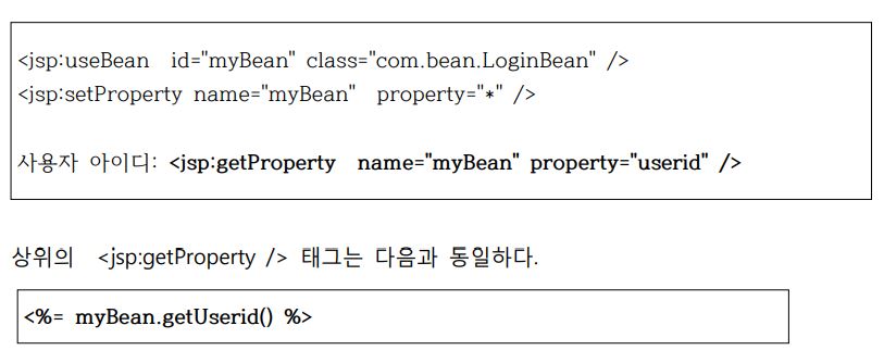 1. 사용자 아이디: <jsp:getProperty name="myBean" property="userid" /> <br>