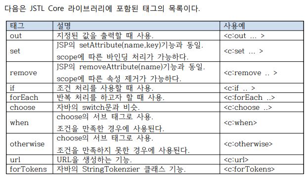 JSP에서 사용 가능한 태그로 앞서 배웠던 JSP 스크립팅 태그 및 액션 태그가 있지만, 사용자 필요에 의해서 태그를 자체적으로 만들어 사용할 수도 있다. 이런 태그를 커스텀 태그(Custom tag)라고 하며 많은 커스텀 태그들 중에서 자주 사용되는 태그들을 묶어서 아파치 그룹에서 제공하는데, 이것을 JSTL이라고 한다. 일반적으로 EL(Expression Language)과 같이 사용된다.